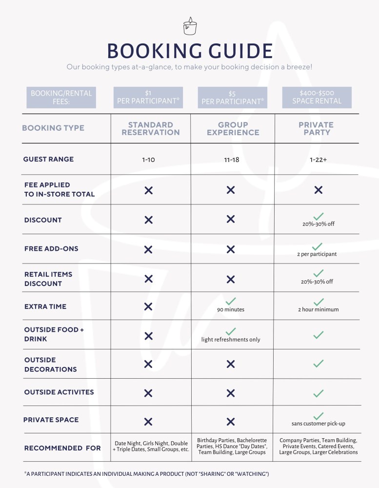 Pricing: Our base private party rental fee is $400 for 2 hours (M-W) or $500 for 2 hours (Th-Sun). This is a space rental fee, is due upfront to secure your booking, and is not applied to your in-store total day-of.